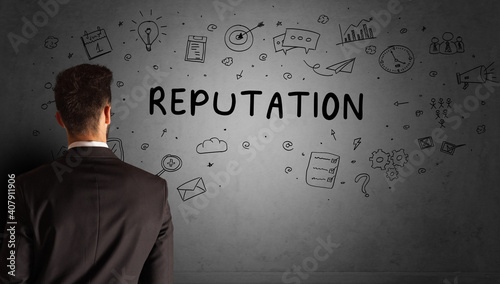 businessman drawing a creative idea sketch with REPUTATION inscription, business strategy concept