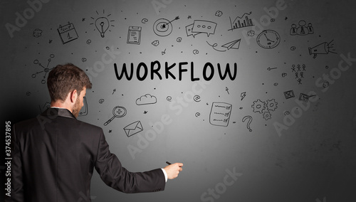 businessman drawing a creative idea sketch with WORKFLOW inscription, business strategy concept