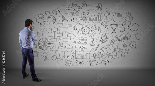 Businessman drawing a project sketch on a wall 3D rendering