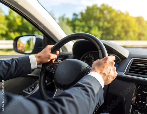 Businessman driving a car on a sunny day
