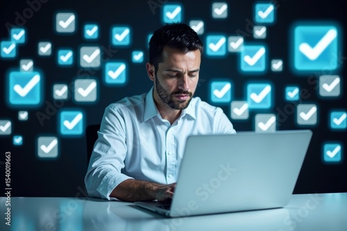 Businessman effortlessly managing a sea of digital checklist documents on his laptop screen