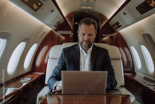 businessman engrossed in his work, crafting a presentation on his laptop during a flight, highlighting his commitment to professional excellence, against the backdrop of the airpla