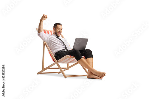 Businessman enjoying on a beach chair with a laptop computer and gesturing win