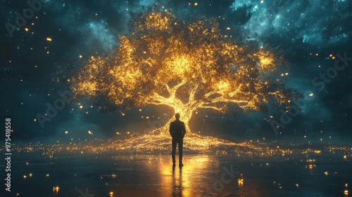 Businessman Envisioning Glowing Idea Tree for Innovation and Growth in Business