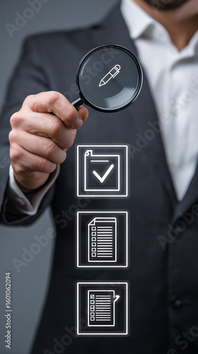 Businessman examining checklist icons with magnifying glass document