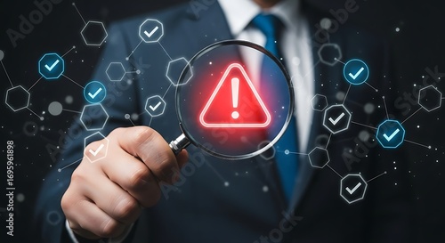Businessman examining digital alert icons and risk assessment data on a futuristic interface