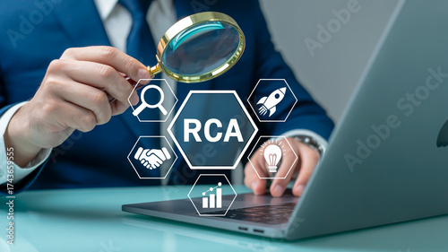 Businessman examining RCA concept with magnifying glass and digital icons on laptop root cause analysis