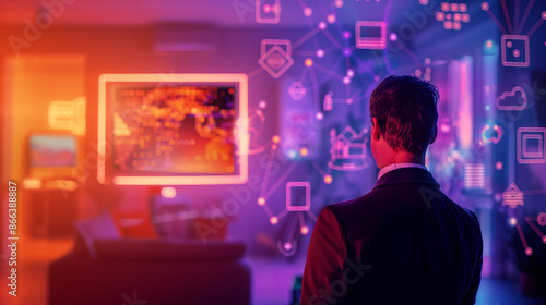 Businessman facing futuristic digital interface. Holographic icons and data networks surround him in vibrant purple and orange hues. Concept of technological innovation.