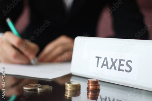 Businessman Filling Tax Reports on Glass Table. Business and Finances Management Concept