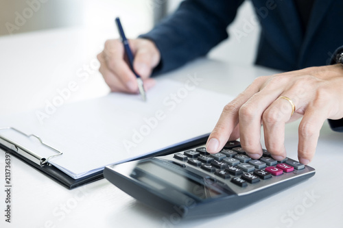 Businessman giving end key to customer after good deal agreement. while loan agreement being approved and calculator, Buy house concept.
