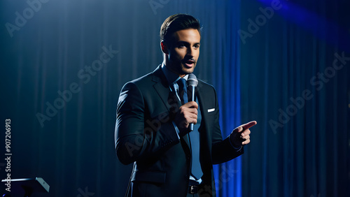Businessman giving speech in front of audience, business conference, ai generated