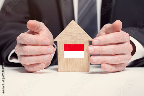 Businessman hand holding wooden home model with Indonesian flag. insurance and property concepts
