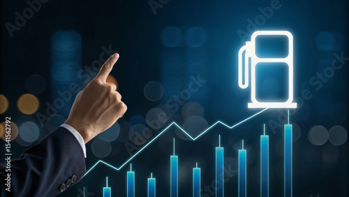 Businessman hand pointing glowing fuel pump icon with upward graph, symbolizing rising oil prices and economic. Economic impact and effect of oil, energy security, financial market connection