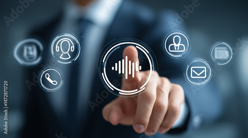 Businessman Hand Pointing Icon with Recording Icon of Smartphone Conversation with Customer, Voice Wave, Telemarketing, Consulting, Access to Data and Voice Application, Write Text and Send Message