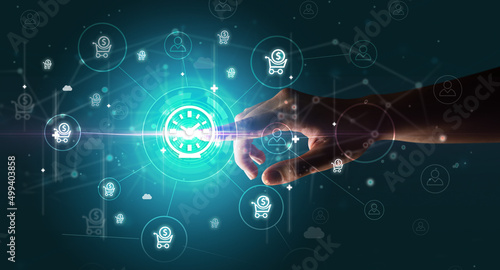 Businessman hand pressing stock graphic information on multitouch screen