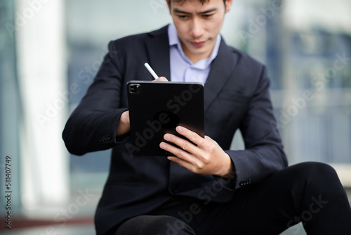 Businessman hand Project manager working and update tasks and Gantt chart scheduling virtual diagram.with smart phone, tablet and laptop