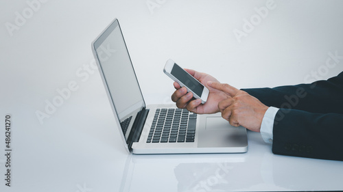 Businessman hand using smartphone with laptop computer. Business and technology concept.