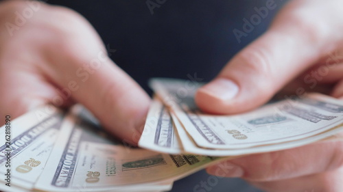 Businessman hands counting many american 20 dollars banknotes 4K close up slow mo