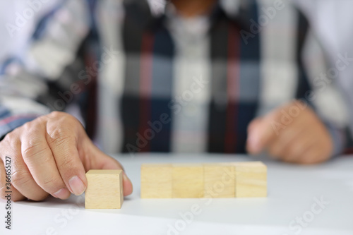 Businessman hands in casual dress sitting and holding weeded block toy stacking or weed cube. This image for business design and leadership or teamwork symbol concept