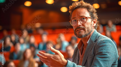 Businessman having a speech in front of big audience in conference hall, theatre. Learning and leisure concept