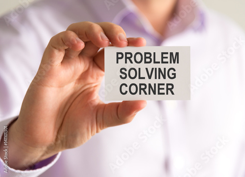 Businessman holding a card with PROBLEM SOLVING CORNER message