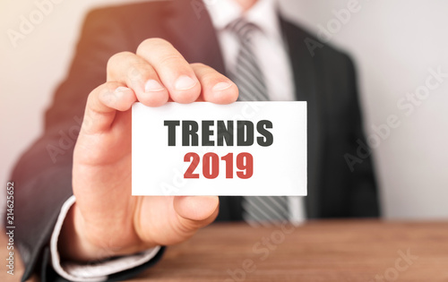 Businessman holding a card with text Trends 2019