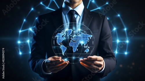 Businessman holding a digital globe hologram, representing global technology and business connection in a futuristic concept.
