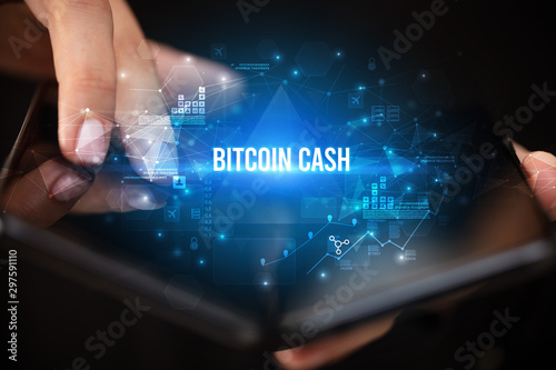 Businessman holding a foldable smartphone with BITCOIN CASH inscription, business concept