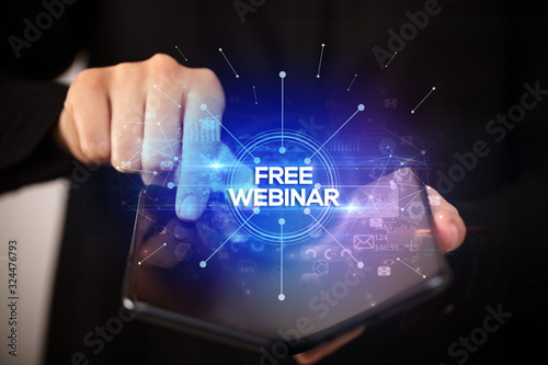 Businessman holding a foldable smartphone with FREE WEBINAR inscription, new business concept