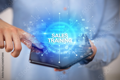 Businessman holding a foldable smartphone with SALES TRAINING inscription, new business concept