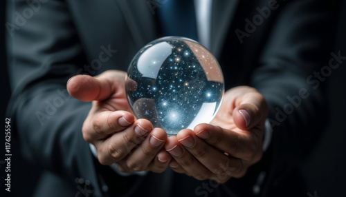 Businessman holding a glass sphere with stars and galaxies.Mystic-themed banner for fortune-telling, business vision, and creative projects.Mystery, foresight, and the universe within—a concept of p