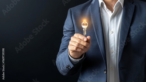 Businessman Holding a Glowing Key with a Confident Expression in a Darkened Environment