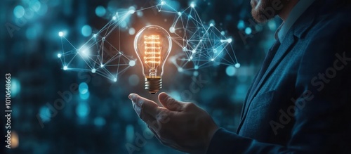 Businessman holding a glowing lightbulb with a network of lines surrounding it.
