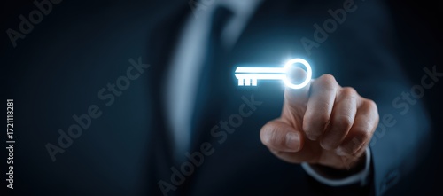 Businessman holding a key icon with copy space, a business concept