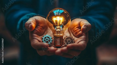 Businessman holding a light bulb and cog inside, symbolizing creativity, inspiration, and innovation for finance and economic growth