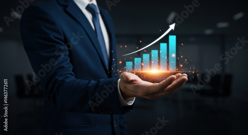 Businessman holding a rising bar graph with an upward arrow in his hand.