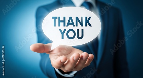 Businessman holding a speech bubble with the text thank you in his open palm, expressing gratitude and appreciation in a professional setting