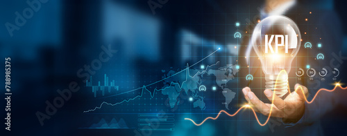 Businessman holding creative light bulb with growth graph and KPI icons. Leveraging innovative technology to develop new strategies and tactics that enhance successful and profitable operations.