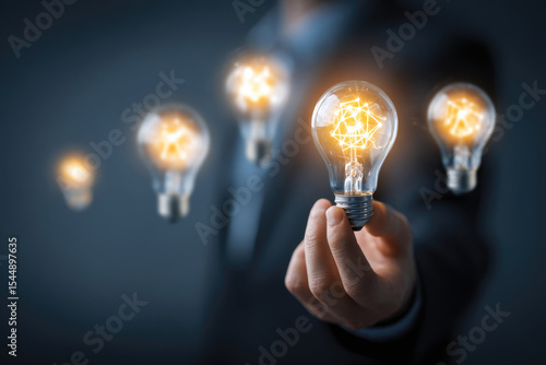 Businessman holding creative light bulb with smart business ideas innovation and inspiration concept