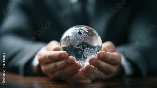 Businessman Holding Glass Globe, Global Business and Environmental Concepts
