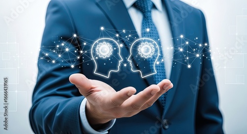 Businessman holding glowing digital heads representing connection communication and artificial intelligence concepts