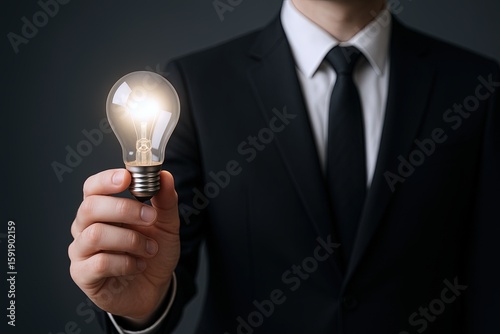 Businessman Holding Light Bulb in Hand in Formal Suit Over Black Background.