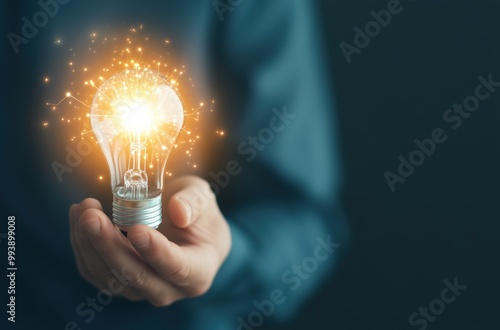 Businessman Holding Light Bulb with Digital Technology Glowing Inside Innovation AI Bu