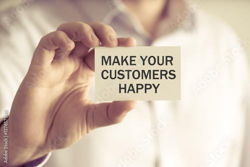 Businessman holding MAKE YOUR CUSTOMERS HAPPY card