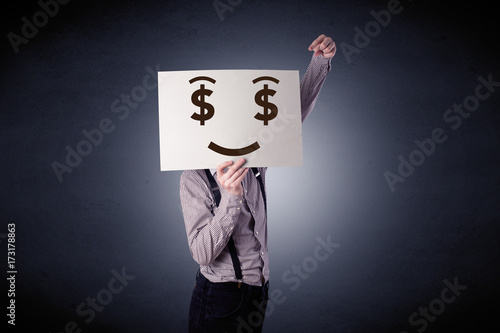 Businessman holding paper with greedy emotion