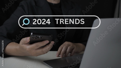 Businessman holding pen with 2024 trends searching bar for marketing monitor and business planning change concept.