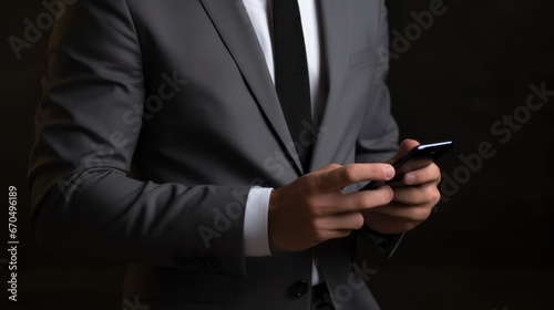 Businessman holding smart phone on dark background, close-up. Generative AI