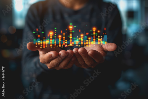 Businessman holding stock market graphic, networking, and data analytics connection, network.