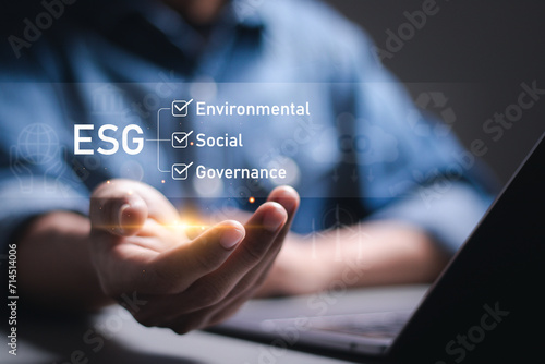 Businessman holding virtual global ESG icons for world sustainable environment concept. social business strategy, environment, business investment strategy. ESG environmental, social and governance.