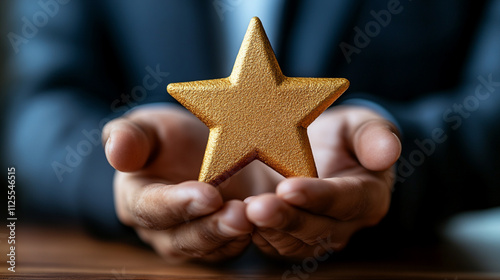 businessman holds a bright yellow star symbolizing success, achievement, and aspiration. The star reflects ambition and the pursuit of goals, representing a shining future in the business world
